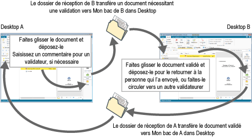 Par exemple, vous pouvez envoyer un document portant la mention suivante : "Pourriez-vous valider svp ?". La personne qui reçoit le document peut renvoyer le document validé en apposant un cachet numérique ou le transférer à une autre personne. Comme le montrent ces exemples, la fonction de transfert des documents vous permet d'obtenir facilement les validations de documents.