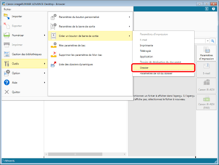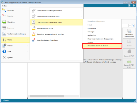 Si un bouton de sortie bac de destination a été enregistré dans la barre de sortie en sélectionnant [Paramètres de lot du dossier], il n'est pas possible de configurer les paramètres détaillés. Si la configuration des paramètres avancés est nécessaire, consulter la section suivante.