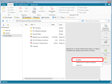 pour le bouton de sortie bac de destination affiché sur le ruban ou la barre d'outils et en sélectionnant [Modifier]. Si un bouton de sortie n'est pas affiché sur le ruban ou la barre d'outils, consulter les sections suivantes pour l'afficher. |