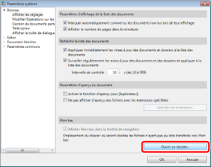 Cliquez sur [Ouvrir un dossier] dans [Emplacement du dossier où seront stockés les fichiers n'ayant pas pu être transférés vers Mon bac].