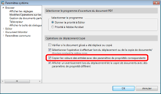 [Paramètres système] > [Browser] > [Modifier/Opérations sur les documents] > [Copier les valeurs des entrées avec des paramètres de propriétés correspondants]