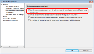 [Paramètres système] > [Browser] > [Gestion de documents partagés] > [Archiver automatiquement lors de la fermeture de l'application de modification des documents]