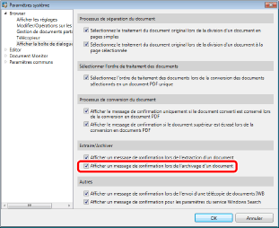 La sélection de [Paramètres système] > [Browser] > [Afficher la boîte de dialogue] > la boîte de dialogue [Afficher un message de confirmation lors de l'archivage d'un document] affiche l'écran de confirmation lors de l'enregistrement d'un document. Si cette case est décochée, l'écran ne s'affichera pas.