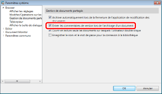 La sélection de [Paramètres système] > [Browser] > [Gestion de documents partagés] > la boîte de dialogue [Entrer les commentaires de version lors de l'archivage d'un document] affiche l'écran de confirmation lors de l'enregistrement d'un document. Si cette case est décochée, l'écran ne s'affichera pas.