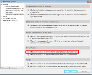 [Paramètres système] > [Browser] > [Afficher la boîte de dialogue] > [Afficher un message de confirmation lors de l'extraction d'un document]
