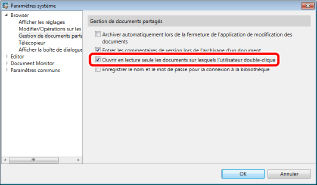 [Paramètres système] > [Browser] > [Gestion de documents partagés] > [Ouvrir en lecture seule les documents sur lesquels l'utilisateur double-clique]