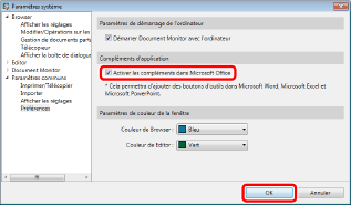 Cocher la case [Activer les compléments dans Microsoft Office] dans [Paramètres système] > [Paramètres communs] > [Préférences], puis cliquer sur [OK].