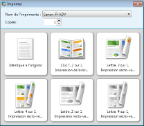 Définir le [Nom de l'imprimante] et l'[Copies], puis cliquer sur le bouton du modèle à utiliser.