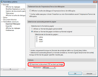 Si la case [Imprimer le document PDF en tant qu'image] est cochée, tous les documents PDF sont imprimés ou envoyés en tant qu'images. Pour les imprimer ou les envoyer en tant que documents PDF, décocher la case.