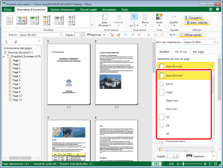 Si le format de papier en sortie est défini sur un paramètre autre que [Auto (Format)] pour un document comportant plusieurs orientations de page ou plusieurs formats, les pages dont l'orientation ou le format diffère de l'orientation ou du format du papier courant sont automatiquement agrandies ou réduites en fonction de la largeur du papier (mais elles ne font pas l'objet d'une rotation automatique).