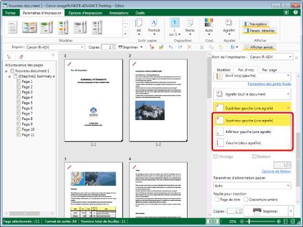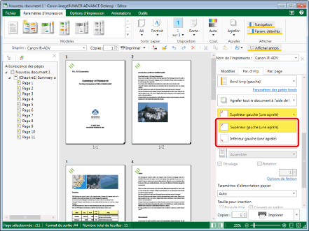 Les paramètres qu'il est possible de définir pour la position Éco (sans agrafe) dépendent du type d'imprimante sélectionné dans [Imprim], de l'orientation/du format du papier en sortie et de l'emplacement de la reliure.
