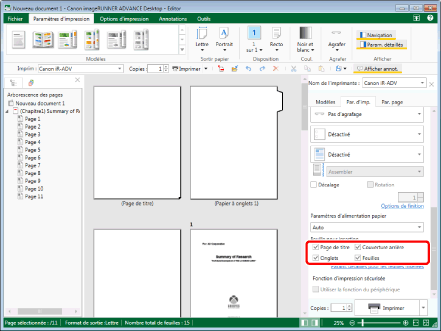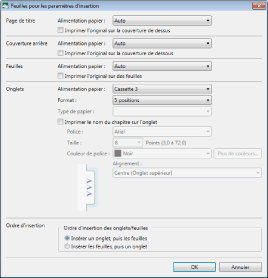 Sélectionner une alimentation papier autre que l'inséreuse dans [Alimentation papier]. Lorsque le papier à onglets est alimenté depuis l'inséreuse, le nom des chapitres ne peut pas être imprimé sur les onglets d'index.