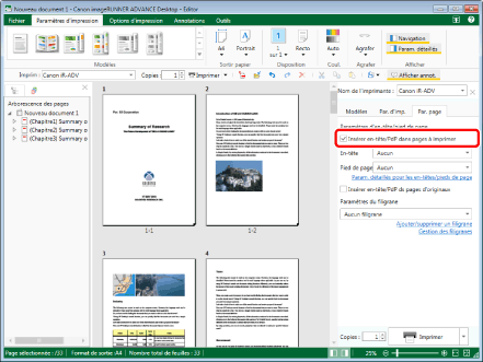 Cocher la case [Insérer en-tête/PdP ds pages d'originaux] pour définir l'en-tête/pied page de la page de l'original. Pour effectuer cette opération à l'aide d'une commande du ruban, cocher la case [Insérer en-tête/PdP] dans le groupe [Pages origin.] du ruban.