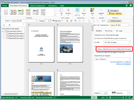 Les paramètres détaillés de pied de page s'affichent lors de leur définition. Il s'agit des mêmes paramètres que pour l'en-tête.