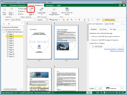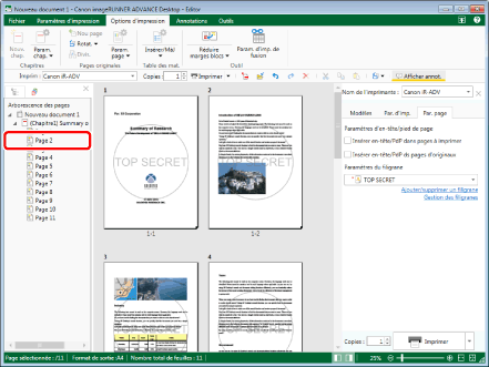 Il est également possible de cliquer avec le bouton droit de la souris sur la page dont les paramètres doivent être modifiés dans l'onglet [Arborescence des pages] de la Fenêtre de navigation et de sélectionner [Ne pas insérer de filigranes dans les pages sélectionnées].
