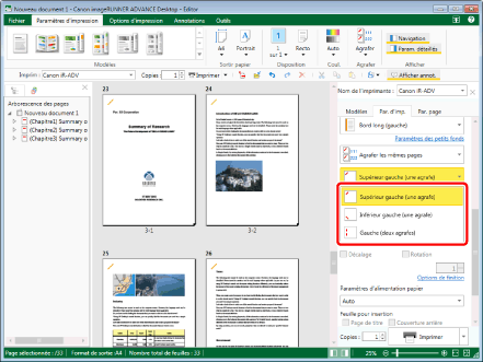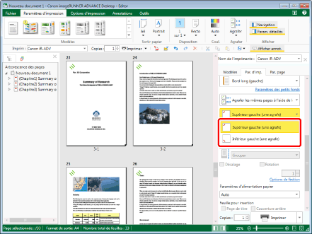 Les paramètres qu'il est possible de définir pour la position Éco (sans agrafe) dépendent du type d'imprimante sélectionné dans [Imprim], de l'orientation/du format du papier en sortie et de l'emplacement de la reliure.