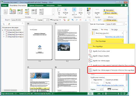 (Agrafer) dans le ruban et sélectionner ensuite [Agrafer les mêmes pages à l'aide de la fonction Sans agrafage].