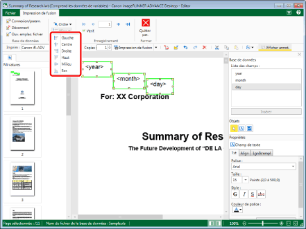 Il est possible d'aligner la position des champs insérés dans le Mode Paramètres d'impression de publipostage de Desktop Editor.