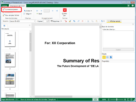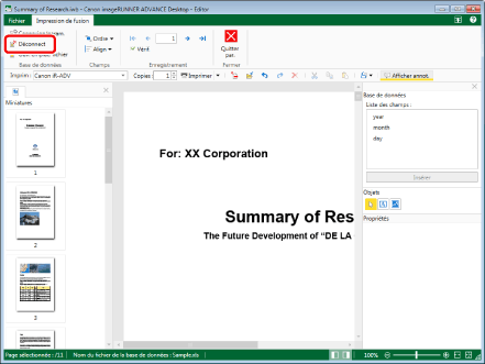 Lorsque la connexion à la base de données est déconnectée, il n'est plus possible d'afficher l'aperçu des champs insérés. La reconnexion à la base de données permet de l'afficher de nouveau.
