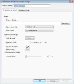 Lorsque l'utilisateur sélectionne cette option, la boîte de dialogue [Paramètres détaillés des champs d'image] s'affiche. Il est alors possible de modifier les détails du champ d'image dans la boîte de dialogue [Paramètres détaillés des champs d'image]. Pour plus d'informations, voir la section suivante.