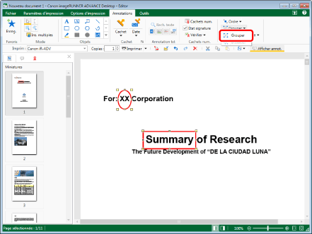 Vous pouvez créer des groupes de groupes, ou regrouper un groupe d'une seule annotation. Lorsque vous regroupez deux groupes, leurs regroupements précédents sont annulés et ils sont regroupés en un seul groupe.