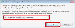 La boîte de dialogue [Confirmer le mot de passe d'autorisation] s'affiche lorsque la case [Limiter les modifications et l'impression du document] est sélectionnée.