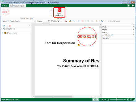 Vous pouvez effectuer les opérations suivantes sur les cachets numériques insérés à un emplacement provisoire.