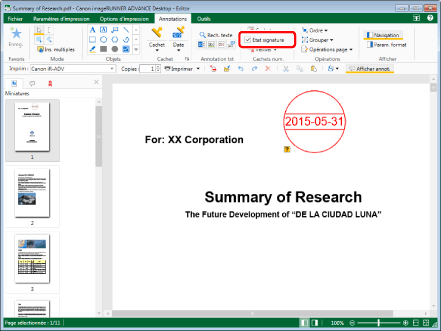 L'état de la signature s'affiche dans le coin inférieur gauche du cachet numérique dans la Fenêtre de travail et fournit les mêmes informations que l'icône affichée en regard de chacune des informations de l'onglet [Liste des signatures] dans la Fenêtre de navigation.