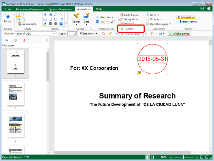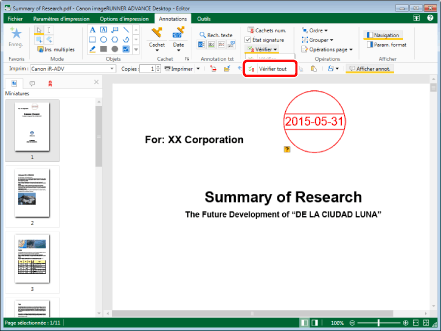 L'onglet [Liste des signatures] affiche les informations sur les cachets numériques joints, dans l'ordre chronologique où ils l'ont été. Toutefois, si la date et l'heure de signature d'un cachet numérique sont inconnues, ce cachet numérique apparaît en fin de liste.