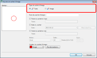 Quand [Texte] est sélectionné, vous pouvez enregistrer des cachets d'image qui utilisent un cercle englobant et la date et le texte spécifiés.