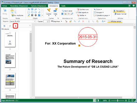 Si un cachet numérique est sélectionné dans une page autre que la page courante, la page contenant le cachet numérique s'affiche automatiquement dans la Fenêtre de travail.