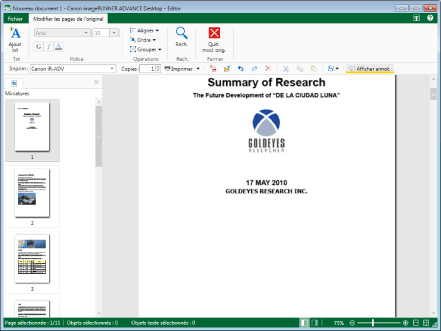 Si l'utilisateur sélectionne un objet dans la Fenêtre de travail, le nombre total d'objets sélectionnés et le nombre d'objets texte s'affichent sur la barre d'état.