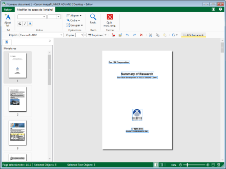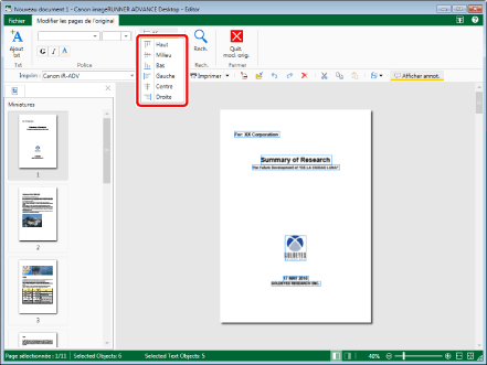 Si l'utilisateur sélectionne un objet dans la Fenêtre de travail, le nombre total d'objets sélectionnés et le nombre d'objets texte s'affichent sur la barre d'état.