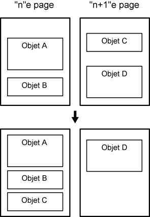 Lorsque la fonction de réduction des marges est exécutée, les marges sont réduites et les objets sont déplacés vers le haut sur chaque page. Par ailleurs, si le bas d'une page présente un espace, les objets de la page suivante sont déplacés dans cet espace.