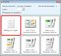 La boîte de dialogue [Impression] ou la boîte de dialogue [Imprimer] de l'application utilisée pour créer le document peut s'afficher. Dans ce cas, sélectionner [Desktop Document Writer] comme imprimante et lancer l'impression.
