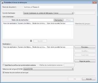 Si plusieurs documents ont été déposés dans [Télécopieur] et que la case [Envoyer un fichier à la fois par télécopie sans combiner plusieurs fichiers] est cochée, la boîte de dialogue [Paramètres d'envoi de télécopies] s'affiche pour le document suivant. Dans ce cas, répéter les étapes 5 à 11.