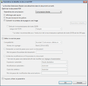 Si la case [Toujours utiliser ce paramètre] est cochée, la boîte de dialogue [Paramètres de détaillés de document PDF] ne s'affiche plus. Pour qu'elle s'affiche lorsqu'un fichier est déposé, cocher la case [Afficher la boîte de dialogue lorsque [Convertir en PDF (paramètres détaillés)]].