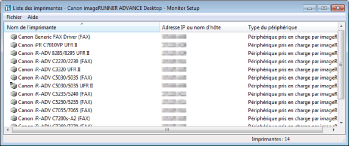 Les champs [Adresse IP ou nom d'hôte] et [Type du périphérique] ou [Type du périphérique] des périphériques et des imprimantes partagées dont les informations n'ont pas pu être récupérées ne sont pas renseignés. Pour contrôler des périphériques dont les informations n'ont pas été récupérées, saisir manuellement les informations. Pour plus d'informations, voir la section suivante.
