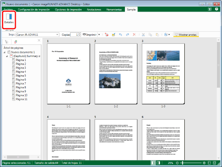 Al usar el Modo de impresión, también puede mostrar la Ventana Detalles haciendo clic en (Conf. detallada) en la cinta.