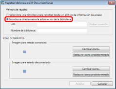 Introduzca la URL de la biblioteca en [URL] y el nombre de la biblioteca en [Nombre de biblioteca]; a continuación haga clic en [Aceptar].