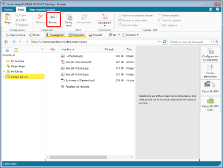 Abra el cuadro de diálogo [Administración de bibliotecas] con la siguiente operación; desde él podrá cambiar el nombre de las bibliotecas.