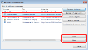 Seleccione las librerías que desea ordenar en [Lista de bibliotecas registradas] y después haga clic en [Arriba]/[Abajo].