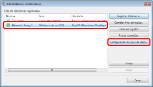 Las Bibliotecas de red (bases de datos) aparecen como "Biblioteca de red (BD)" en el campo [Tipo] del cuadro de diálogo [Administración de bibliotecas].