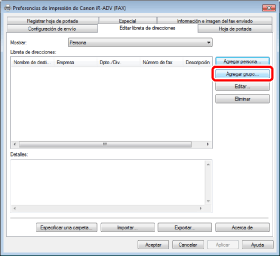 Puede editar la información de destino personal registrada. Para obtener más información, consulte la Ayuda haciendo clic en [Ayuda] en la esquina inferior derecha de la pantalla de configuración de impresión del controlador del fax.
