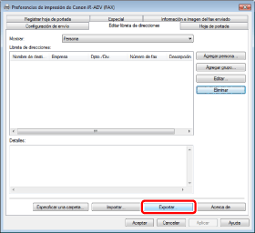 Asegúrese de especificar una carpeta para la cual tenga derecho de escritura (Windows) para la carpeta de destino de guardado de la libreta de direcciones, por ejemplo la carpeta [Documento].