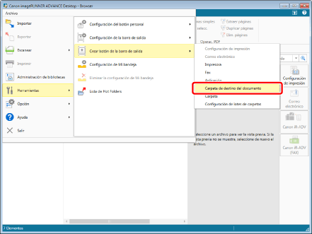 También puede crear una Carpeta de destino del documento desde Desktop Editor. Para crear una Carpeta de destino del documento desde Desktop Editor, seleccione el menú [Archivo] > [Configuración/Administración] > [Crear carpeta de destino del documento].
