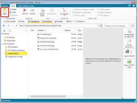 Seleccione la biblioteca o carpeta de destino en la Ventana de navegación o la Ventana de visualización de la lista de archivos.
