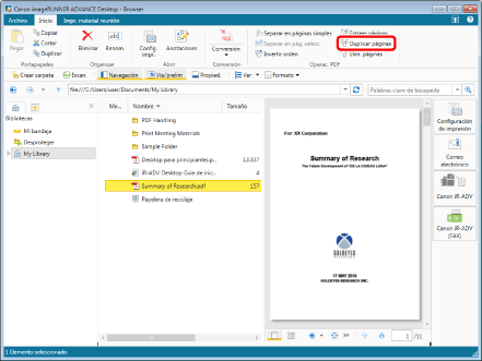 Si seleccionó varias páginas con la vista miniatura, el documento PDF duplicado se guarda añadiendo el "_número de página de la primera página seleccionada" en el nombre del documento.