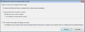 Aunque establezca no visualizar el cuadro de diálogo, puede visualizarlo seleccionando el cuadro de diálogo [Seleccionar procesamiento de documento original al separar el documento en la página seleccionada].