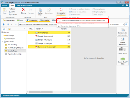 (Conversión) en la cinta y seleccione [Convertir documentos seleccionados en un único documento PDF].